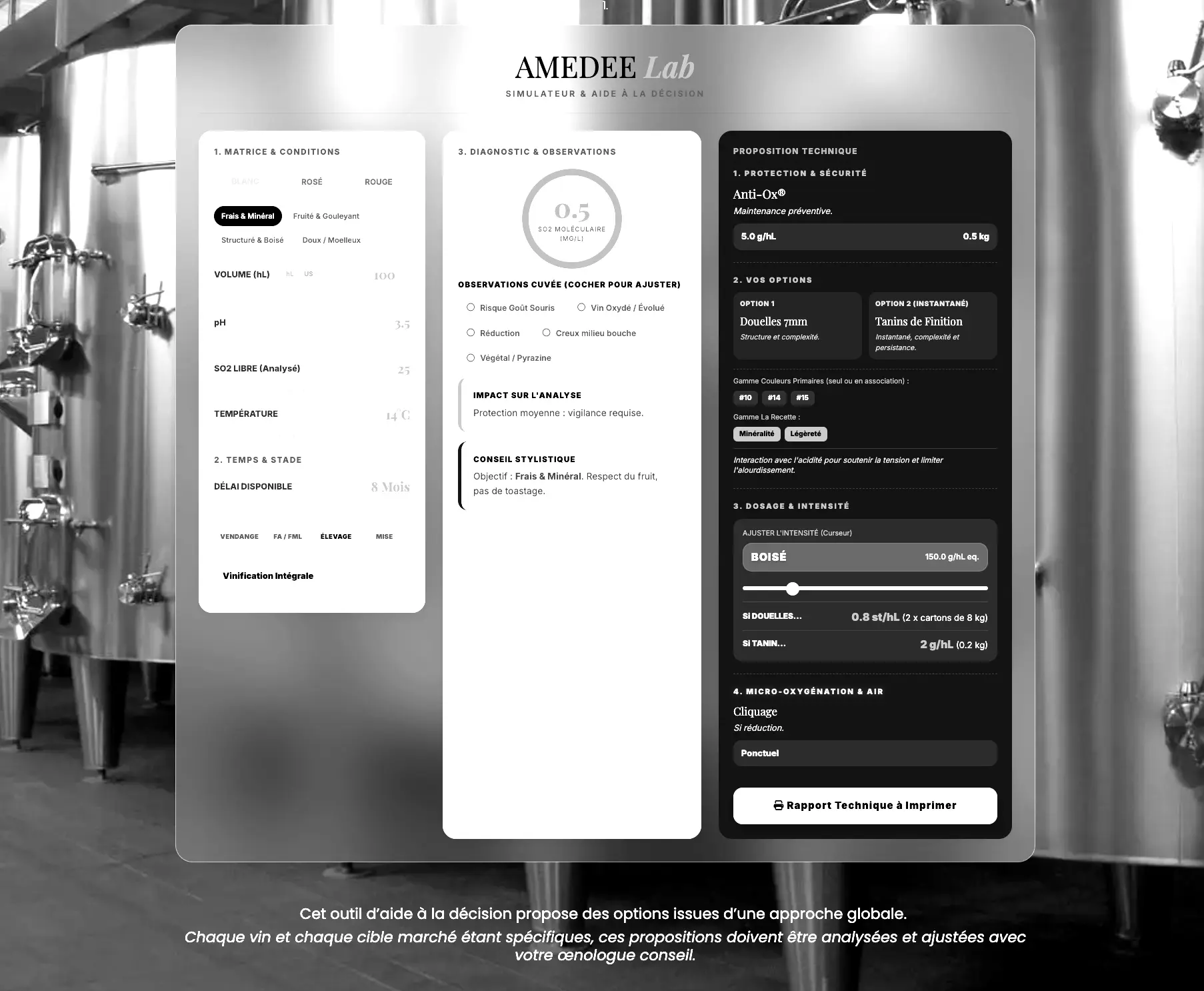 Discover our tools that provide you with clear, quantified, and immediately applicable oenological recommendations to make quick decisions and secure your choices regarding the use of wood and tannins, all for free.